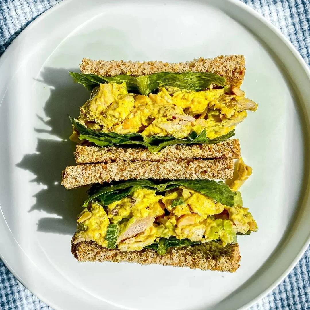 Whisk together mayo, chutney, white wine vin, spicy curry powder, and salt. Fold in the remaining ingredients. Serve on toasted bread with bib lettuce.